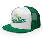 This classic trucker hat sports a printed vintage baseball design on a kelly green and white hat.